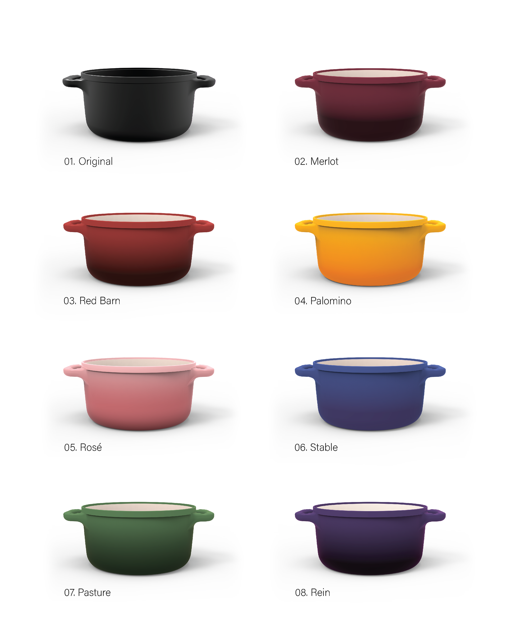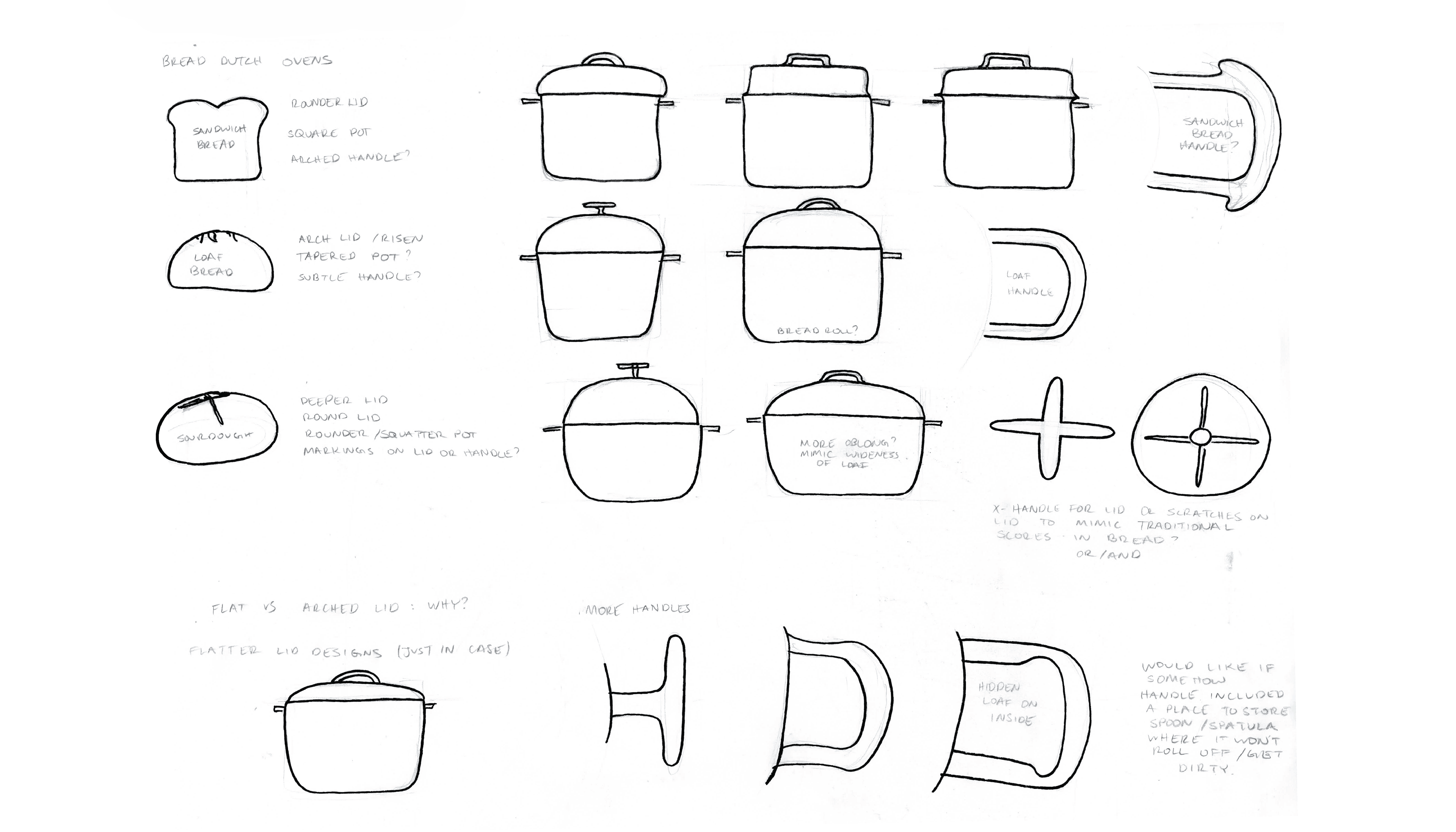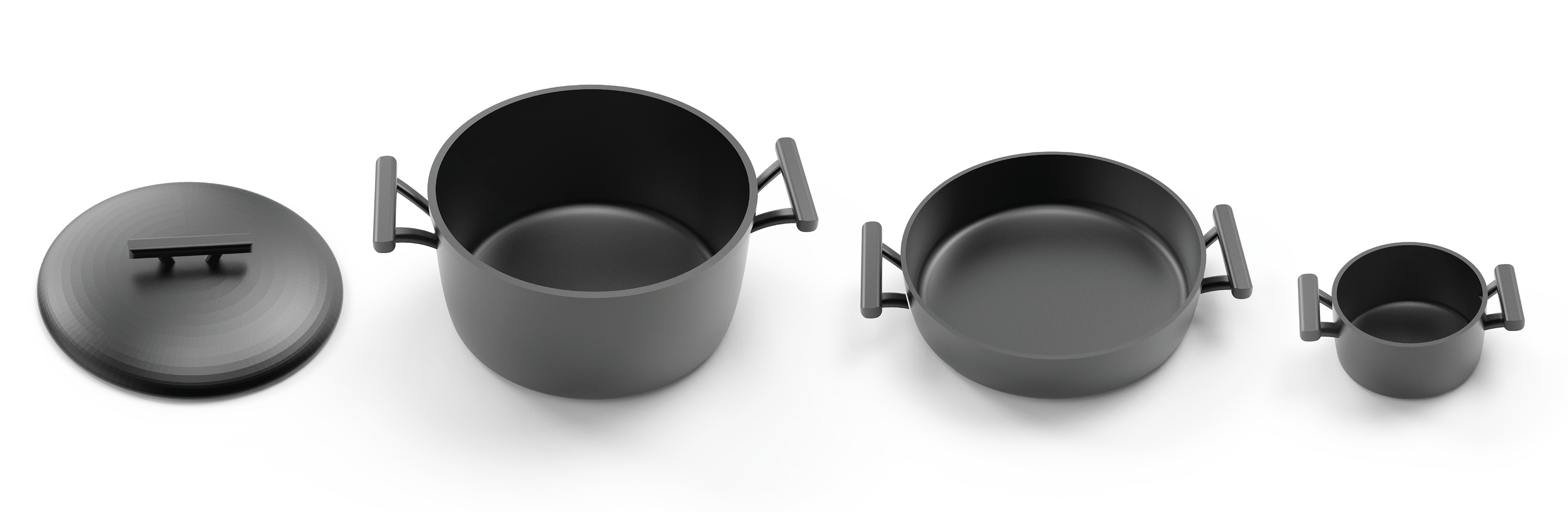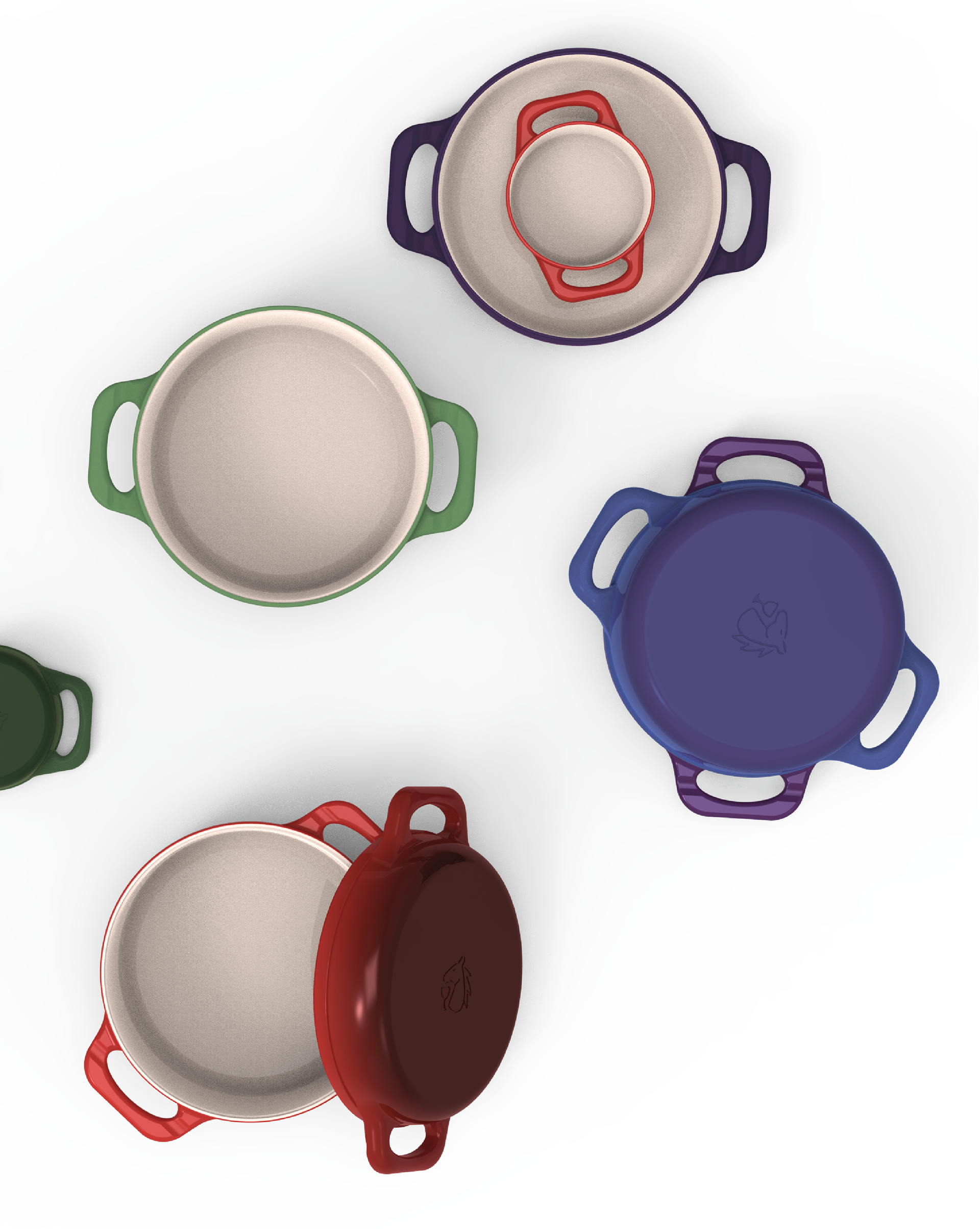 2. 3D printed prototypes: lid, Dutch oven, skillet, and mini cocotte.