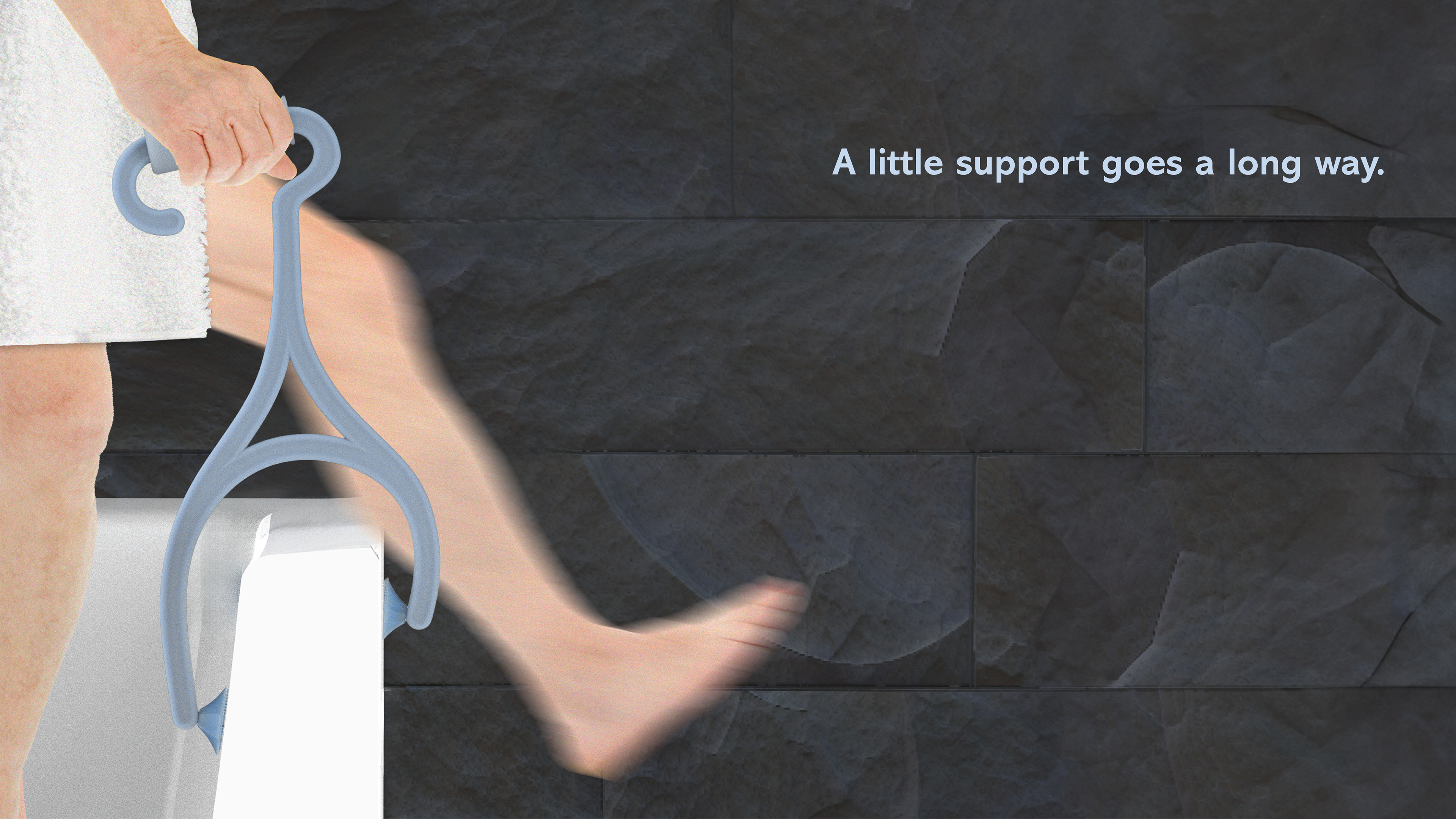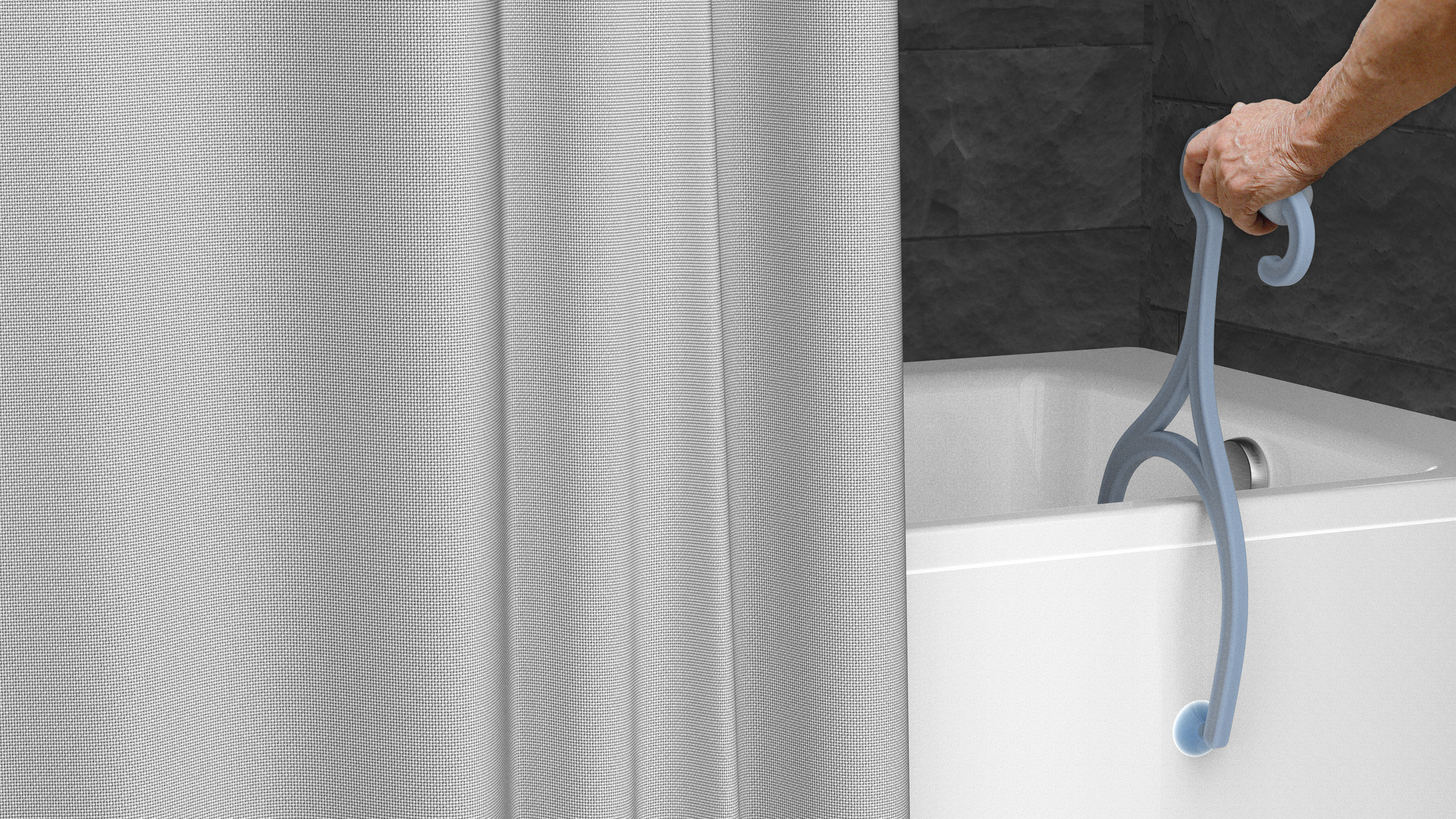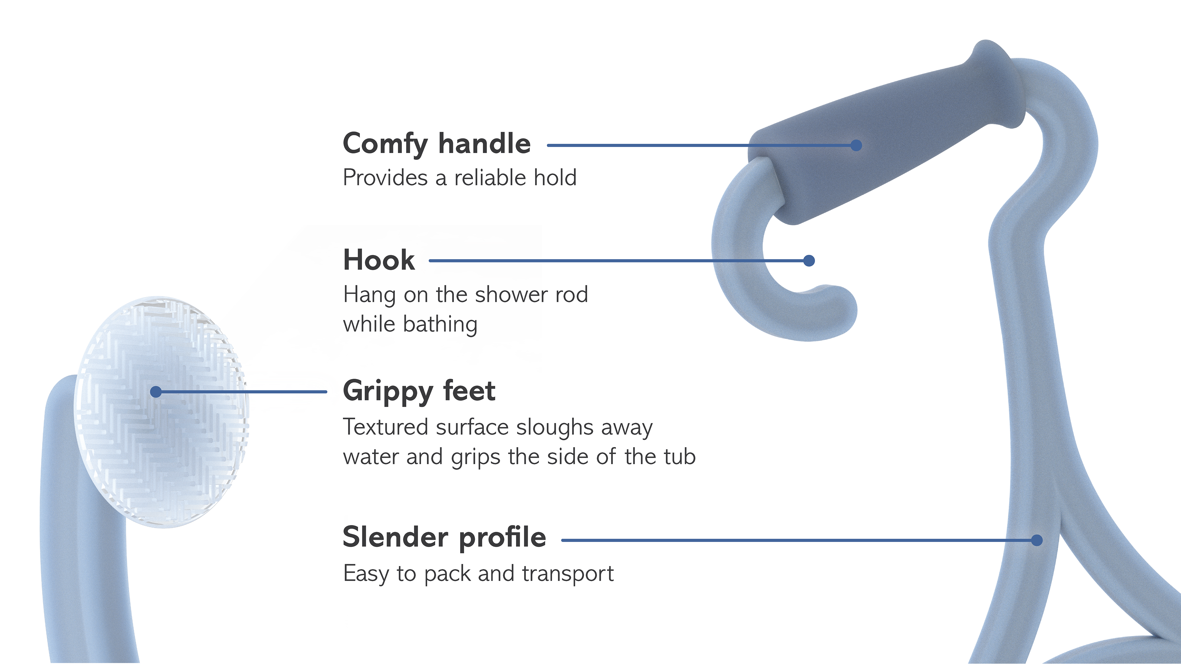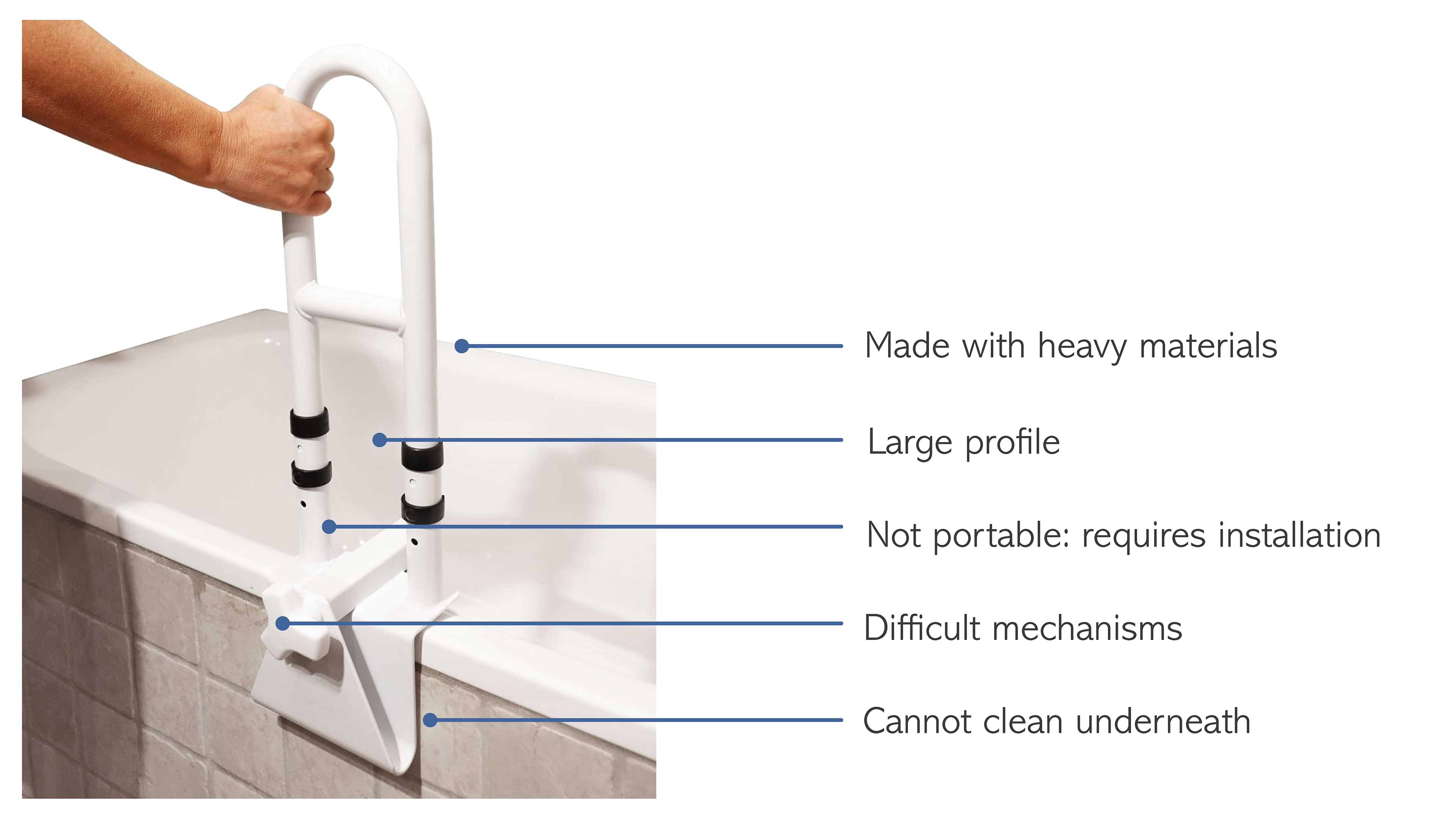When force is applied directly down, the bath aid rotates around a point and locks into place. It's a walking cane for the bathtub: when force is exerted in the direction of the rotation, SureStep provides balance without wobbling.
